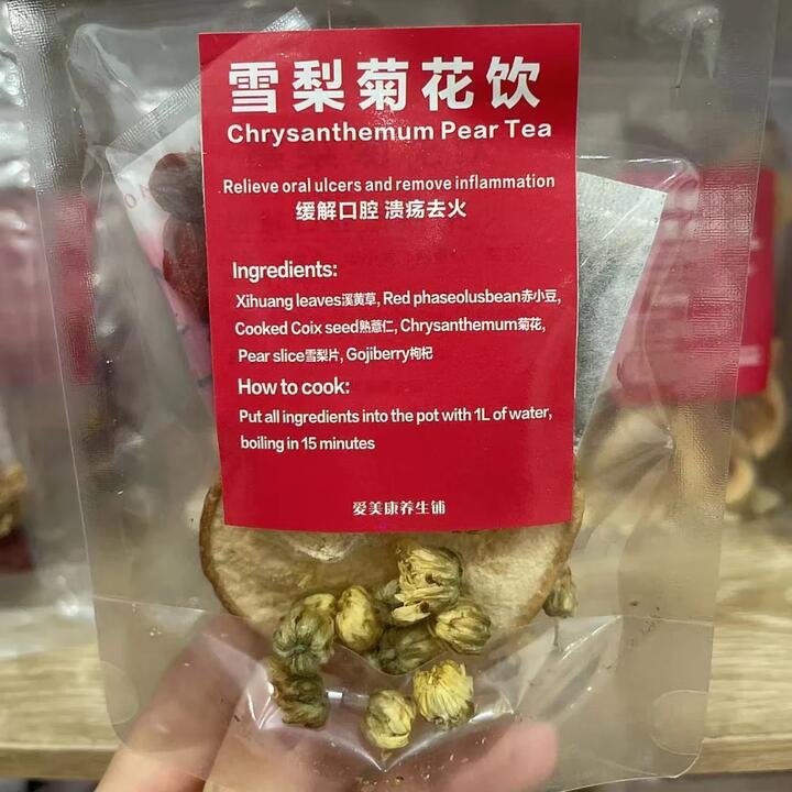 Aimeikang Chrysanthemum Pear Tea is a ready-to-brew herbal pack featuring chrysanthemum blossoms, pear slices, goji berries, coix seed and other traditional ingredients for a clean, gently floral cup. Simply simmer the whole sachet in 1L of water for about 15 minutes to enjoy a soothing, aromatic infusion. Product Highlights: Traditional Blend: Chrysanthemum paired with pear for a light, refreshing taste. Includes goji berry, coix seed, red beans and herbs. Easy to Brew: One pack per pot; simmer in 1L water for ~15 minutes. Versatile Enjoyment: Delicious warm or chilled. Pantry-Friendly: Shelf-stable; store in a cool, dry place.