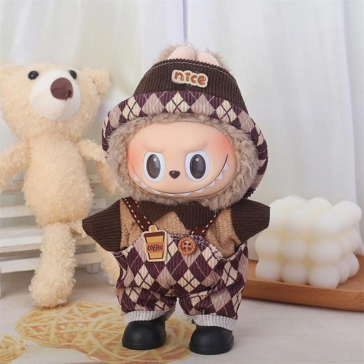 Argyle Coffee Outfit for 17 cm Labubu Doll – Hooded Romper with Suspender Detail (Doll & Shoes Not Included)