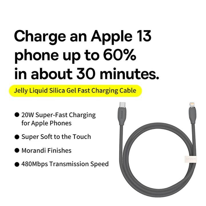 Experience rapid charging with the Baseus Liquid Silicone Fast Charging Cable. This Type-C to iP cable supports 20W fast charging, allowing you to power up your devices quickly and efficiently. Its liquid silicone material ensures durability and a tangle-free experience. Product Highlights: Fast Charging: 20W power delivery for quick charging. Durable Material: Made with liquid silicone for enhanced resilience. Tangle-Free Design: Easy to store and use without tangling. High-Speed Data Transfer: 480Mbps transmission speed. Compatible with Apple Devices: Designed for seamless use with Apple products.