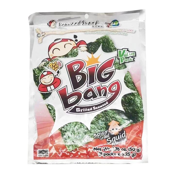 Enjoy the delicious and unique taste of Big Bang Grilled Seaweed in Spicy Grilled Squid Flavor. This value pack contains 8 individual packs, each weighing 6.25g, for a total of 50g. Perfect for a quick snack or to add a flavorful crunch to your meals, these seaweed sheets are seasoned with a spicy grilled squid flavor. Made from high-quality seaweed, they offer a healthy and tasty alternative to traditional snacks. Conveniently packaged for on-the-go enjoyment, Big Bang Grilled Seaweed is a must-have for seaweed lovers looking for a spicy twist.