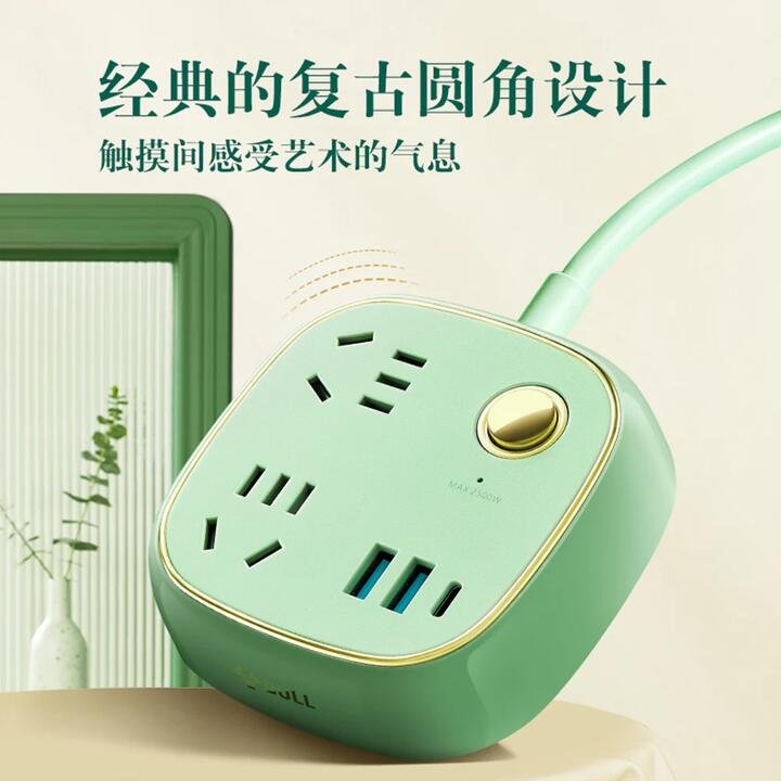 Bull 20W Fast Charging Vintage Extension Cord Socket with 3 Plug Points + 2 USB + 1 Type-C, 1.5m Total Control GN-R602KQ in Celadon Green