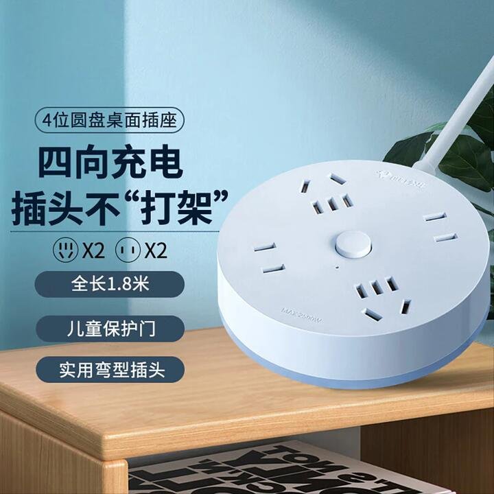 A compact, sky blue, round power strip featuring 4 outlets with master control and a 1.8m cable, designed for convenient and efficient power distribution.