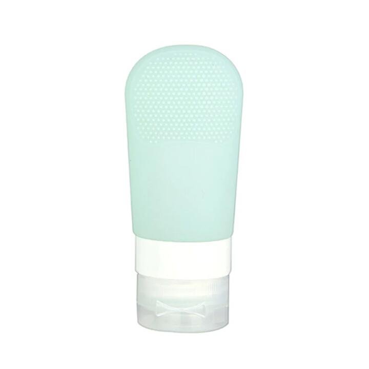 A 60ml silicone refill bottle in olive green for easy and mess-free dispensing of your favorite beauty products.