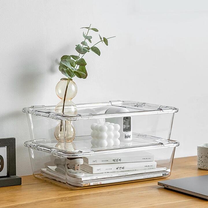 Organize your space with the FaSoLa Transparent Desktop Storage Box. Made from durable PET material, this storage box is designed to be sturdy and long-lasting. The transparent design allows you to easily see the contents, making it perfect for storing office supplies, cosmetics, or other small items. Its stackable design and anti-slip bottom ensure stability and efficient use of space. Dimensions: 36.5cm x 27cm x 10cm. Keep your desk neat and tidy with this versatile and stylish storage solution.