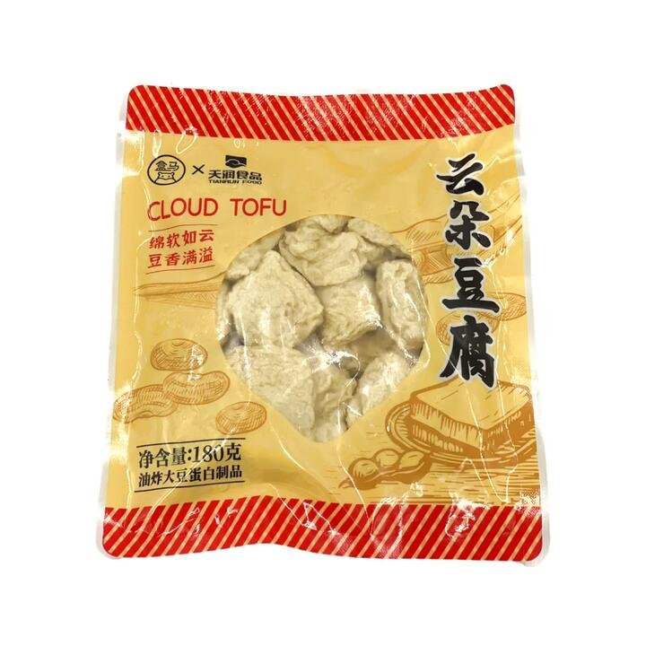 Hema Cloud Tofu is a frozen, pre-fried soy product with a light, cloud-like texture that eagerly soaks up sauces and broths. These tender tofu puffs are ideal for hot pot, stews, and quick stir-fries when you want comforting, restaurant-style dishes at home. Product Highlights: Fluffy “cloud” texture: Soft, porous tofu pieces that absorb rich flavours from soup or sauce. Pre-fried and ready to cook: Go straight from freezer to pot, pan, or stew with minimal prep. Perfect for hot pot: A classic addition that stays bouncy while soaking up spicy or savoury broths. Versatile in the kitchen: Great in braises, noodle soups, and vegetable stir-fries. Convenient 180 g pack: Easy to portion for solo meals or family sharing. Search terms Search keywords: cloud tofu, Hema tofu, frozen tofu puffs, 云朵豆腐, 油炸豆腐, fried soybean protein, hot pot tofu