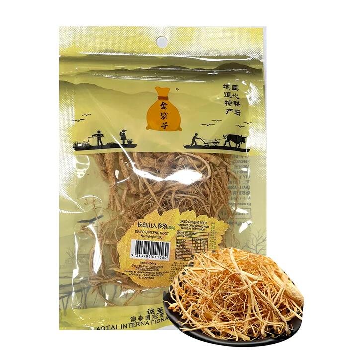 Premium quality Changbai Mountain ginseng roots from Golden Pouch Brand, weighing 75g. Sourced from the renowned region for its potent and beneficial ginseng properties. Perfect for brewing tea or incorporating into traditional Chinese medicine practices.