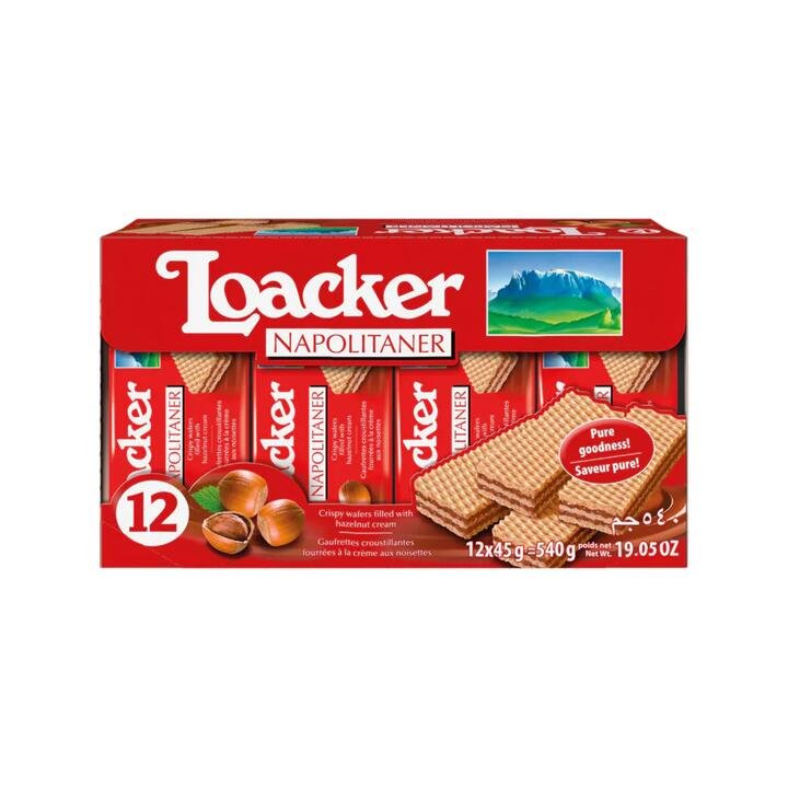 Enjoy the classic taste of Loacker Napolitaner Hazelnut Wafer Biscuits. Each 45g pack features delicate, crispy wafer layers filled with rich hazelnut chocolate cream made from high-quality Italian hazelnuts. Perfectly portioned in a box of 12 for on-the-go snacking or sharing with friends and family. Product Highlights: Premium Italian Hazelnuts: Made with freshly roasted hazelnuts for authentic flavor. Pure Ingredients: No hydrogenated fats, no artificial colors or preservatives. Crispy and Creamy: Multi-layer wafers filled with smooth chocolate-hazelnut cream. Convenient Portions: 12 individual 45g packs, ideal for snacking and gifting. Authentic Quality: Crafted by Loacker, renowned for its Austrian wafer expertise.