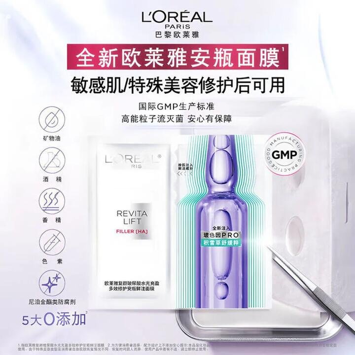 L’Oréal Paris Revitalift Filler Ampoule Sheet Masks combine concentrated Pro-Xylane and vitamin B5 in a soothing fabric mask that helps plump, hydrate and comfort stressed skin. The gentle, minimalist formula is suitable even after cosmetic treatments, offering a quick at-home boost for a smoother, refreshed complexion. Product Highlights: Ampoule-Level Care: Each mask is infused with a high concentration of active serum for intensive treatment. Pro-Xylane & Vitamin B5: Helps improve skin bounce and reinforce the moisture barrier for a supple feel. Comforting for Sensitive Skin: Designed to be used even on delicate or post-procedure skin (non-medical cosmetic use). Clean Formula Focus: Free from mineral oil, alcohol, colourants and added fragrance for a kinder skin experience. Convenient 5-Pack: Individually wrapped masks—ideal for weekly care, travel, or a quick pre-event glow-up. Search terms Search keywords: L’Oreal Paris, Revitalift Filler, ampoule sheet mask, Pro-Xylane, vitamin B5 mask, 欧莱雅, 玻色因, 欧莱雅面膜