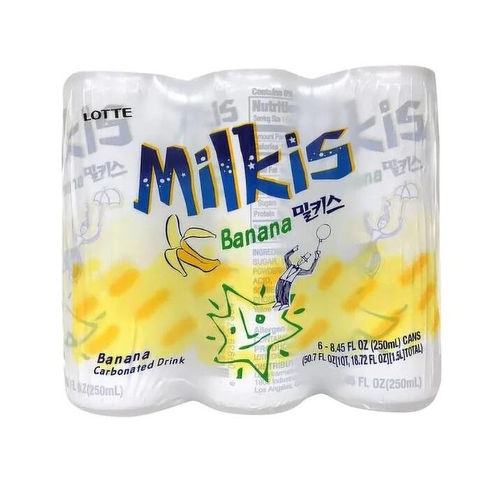 A 6-pack of Lotte Milkis Banana Flavored Soda Water, offering a unique blend of milk and carbonated water with a sweet banana taste in 250ml cans.