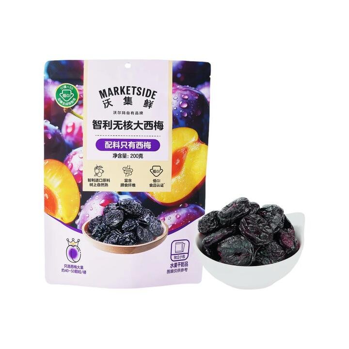 Marketside Pitted Chilean Prunes bring rich, fruity sweetness in a convenient 200 g pouch. Carefully dried and fully pitted, they’re ready to enjoy straight from the pack or to enhance your favourite sweet and savoury recipes. Product Highlights: Premium Chilean fruit: Made from carefully selected plums grown in Chile. Seedless convenience: Fully pitted prunes, ideal for snacking, baking, or cooking. Simple ingredient list: Just prunes, with no added fillers. Versatile uses: Enjoy on their own, in breakfast bowls, trail mixes, or desserts. Resealable pack: Handy 200 g stand-up pouch helps keep every prune soft and flavourful. Search terms Search keywords: Marketside, 沃集鲜, Chilean prunes, pitted prunes, dried plums, 智利无核西梅, dried fruit snack