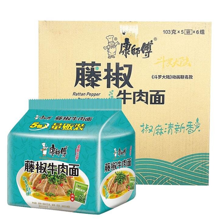 Experience the unique and refreshing flavor of Master Kong Rattan Pepper Beef Noodles. This box contains 6 packs, each with 5 bags of 103g noodles, perfect for satisfying your cravings. The noodles are infused with the aromatic and numbing taste of rattan pepper, combined with tender beef slices for a rich and layered flavor. Enjoy the chewy texture of the noodles and the invigorating pepper oil packet that adds a fresh and spicy aroma. Ideal for a quick meal or a delicious snack, these noodles bring a touch of Sichuan cuisine to your table.