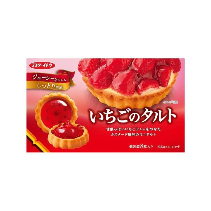 Mister Ito Strawberry Jam Mini Tarts are bite-sized Japanese pastries filled with sweet-tart strawberry jam on a soft, moist tart base. A layer of custard-style cream adds richness, making each tart a delightful match for tea, coffee, or an afternoon treat. Individually wrapped, they are convenient for lunchboxes, office snacking, or sharing with friends. Product Highlights: Authentic Japanese Snack: Made by Mister Ito, a well-known Japanese maker of biscuits and baked treats. Fruity Filling: Sweet and tangy strawberry jam with a custard-style layer for extra creaminess. Moist Tart Shell: Soft, cake-like tart base that complements the juicy filling. Portion-Controlled: 8 individually wrapped mini tarts in a compact 80g box. Perfect Anytime Treat: Enjoy as a dessert bite, tea-time snack, or fun addition to lunchboxes.