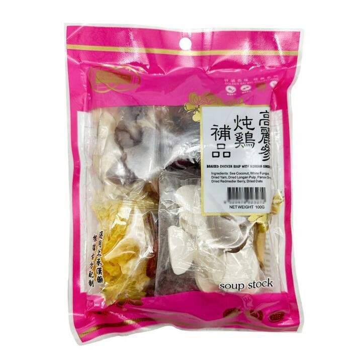 Experience the nourishing benefits of Qiancheng Korean Ginseng Chicken Soup, a 100g pack of premium ingredients. This soup mix includes sea coconut, white fungus, dried yam, dried longan, Poria, Panax ginseng, dried redmiber berry, and dried date. Simply wash the ingredients, boil with water and lean pork or half a chicken, and simmer for about 2 hours to enjoy a rich and flavorful soup. Perfect for a healthy and comforting meal, this Korean Ginseng Chicken Soup is easy to prepare and packed with traditional herbal goodness.