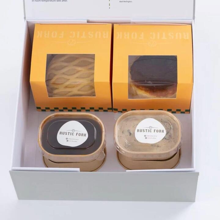 From Rustic Fork, this frozen duo pairs a mini Beef Wellington (1 serving) with a 4‑inch cheesecake, complete with two signature sauces for effortless plating at home. A refined main-and-dessert bundle that’s ideal for date nights, small celebrations, or gifting. Product Highlights: Main + Dessert: Mini Beef Wellington and 4‑inch cheesecake in one box. Two Signature Sauces: Ready to heat and serve alongside your Wellington. Frozen Convenience: Keep in the freezer and prepare when needed. Entertaining Made Easy: Restaurant‑style finish with minimal prep. Perfect Size: Individual Wellington plus a shareable 4‑inch dessert.