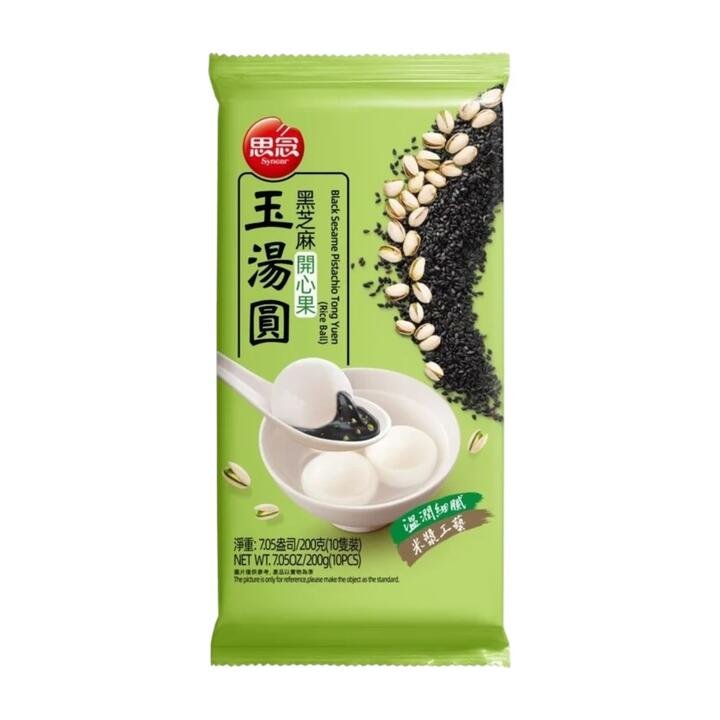 Synear Black Sesame & Pistachio Glutinous Rice Balls bring a classic Chinese dessert to your table in minutes. Each chewy rice ball is filled with a fragrant blend of roasted black sesame and pistachio paste, perfect for a warming sweet soup or festive treat. Product Highlights: Rich Nutty Filling: Smooth black sesame and pistachio centre for deep, aromatic flavour. Chewy Glutinous Shell: Soft, stretchy rice dough that turns delightfully tender when boiled. Convenient Pack Size: 200g pack with 10 pieces, ideal for sharing or a quick dessert. Easy to Prepare: Cook from frozen in boiling water—no thawing needed. Perfect for Festivals: A traditional choice for Lantern Festival, family gatherings, or cosy winter nights. Search terms Search keywords: tang yuan, glutinous rice balls, black sesame rice balls, Synear, 思念, 黑芝麻汤圆, pistachio tang yuan