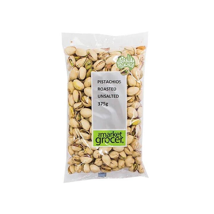 Enjoy the natural goodness of The Market Grocer Roasted Unsalted Pistachios. These premium pistachios are roasted to perfection, offering a delicious and healthy snack option without added salt. Product Highlights: Natural Flavor: Roasted to enhance the nutty taste without added salt. High-Quality: Sourced from the finest pistachio growers. Healthy Snack: A nutritious option rich in protein and fiber. Convenient Packaging: Comes in a 375g pack, perfect for sharing or on-the-go snacking. Versatile Use: Great for snacking, baking, or adding to dishes.