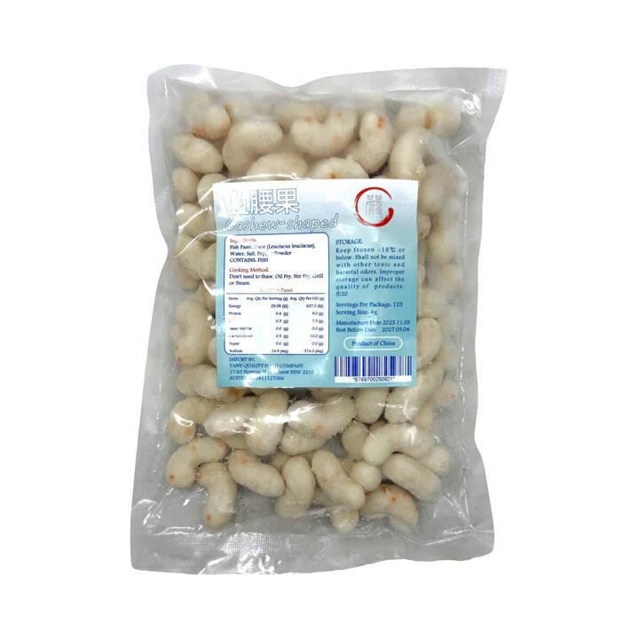 Yan Frozen Cashew-Shaped Fish Pieces are fun, bite-sized fish paste snacks shaped like cashews, perfect for adding texture and flavour to your favourite dishes. Simply cook from frozen and enjoy them deep-fried, stir-fried, grilled, or in a bubbling hotpot. Product Highlights: Cashew-Shaped Pieces: Playful shape that crisps up beautifully when fried or grilled. Versatile Cooking: Ideal for hotpot, stir-fries, skewers, party platters, and noodle soups. Cook From Frozen: No thawing required—just add straight to the pan, pot, or fryer. Family-Friendly Snack: Mild seafood taste that pairs well with dipping sauces. Convenient 500g Pack: Easy to portion for quick meals or sharing with friends and family. Search terms Search keywords: fish cashew, 鱼腰果, 严牌, Yan fish snack, cashew-shaped fish, frozen fish cake, hotpot fish ball