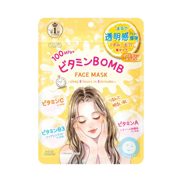 From Japanese brand KOSÉ Cosmeport, Clear Turn Vitamin Bomb (Yellow) targets visible pores and dullness to deliver a fresh, luminous look in just 8 minutes. This sheet mask blends Vitamin C with niacinamide and a gentle retinol derivative for smoother, brighter-looking skin. Product Highlights: Pore Care & Brightening: Vitamin C helps visibly even tone and boost radiance. Niacinamide (Vitamin B3) supports pore-tightening and texture care. Glow-Boosting Care: Includes a retinol derivative (Vitamin A) for a smoother look. Quick Self-Care: 8-minute treatment delivers a rested, refreshed appearance. Comfort Fit: Soft sheet saturated with serum; suitable for regular use.